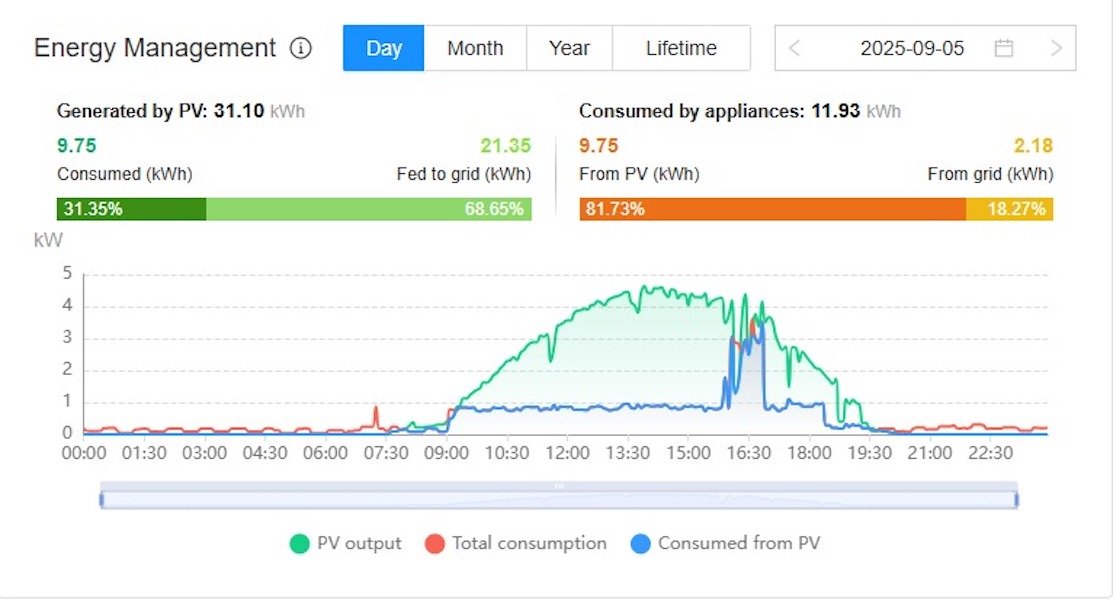 The solar installation is performing excellently, even on overcast days. The system has generated up to 23kWh of electricity during such conditions, and on sunnier days, it reached 31kWh. Additionally, the client switched to a virtual battery solution, further enhancing the system’s efficiency. The expected break-even period is 4 years, providing her with long-term savings and fantastic ROI.